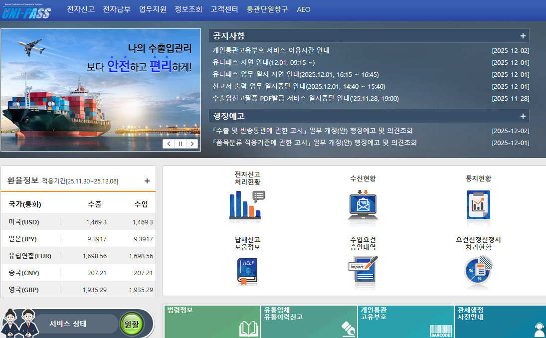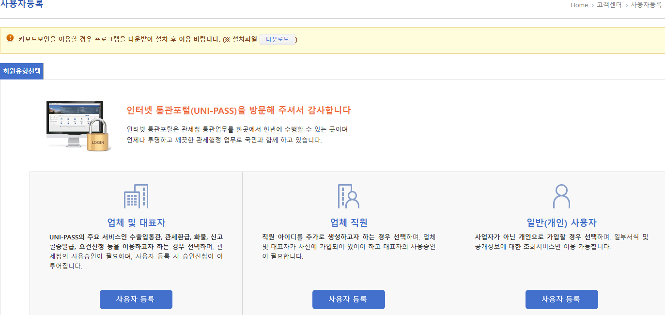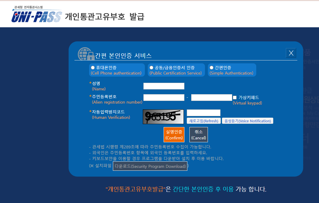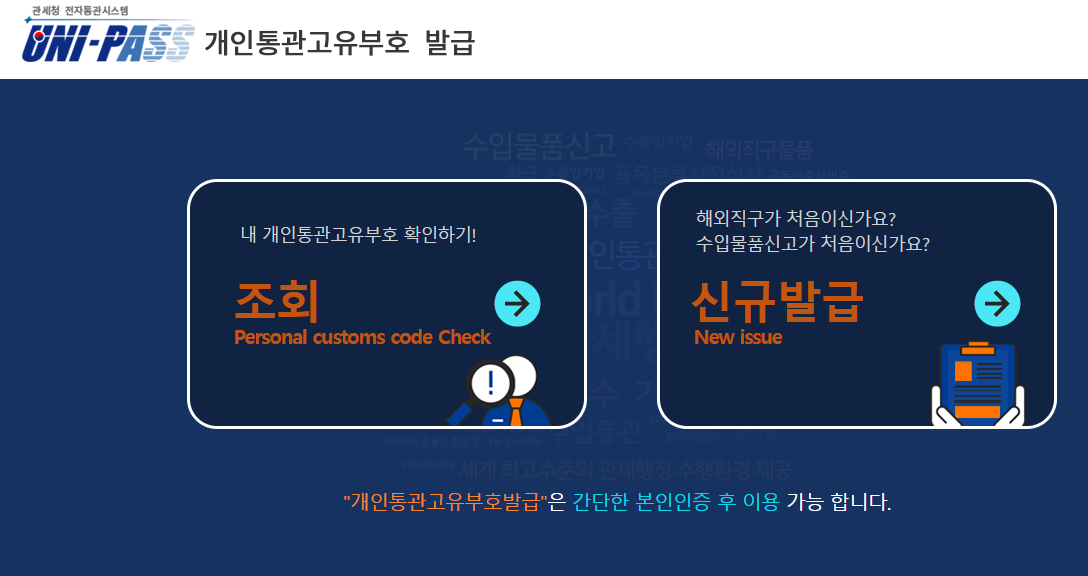 **유니패스(UNIPASS)**에서 본인인증 후 간편하게 가능하다.