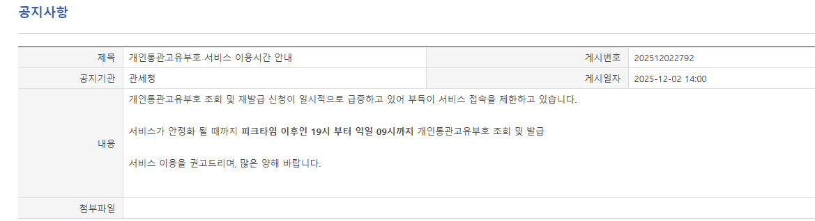도용이 의심될 경우 관세청 고객센터 125를 통해 신고 가능하다. 그런데 현재 접속자가 많아 먹통이 일어나기도 한다. 몰리는 시간대를 피해 재발급하면 된다.