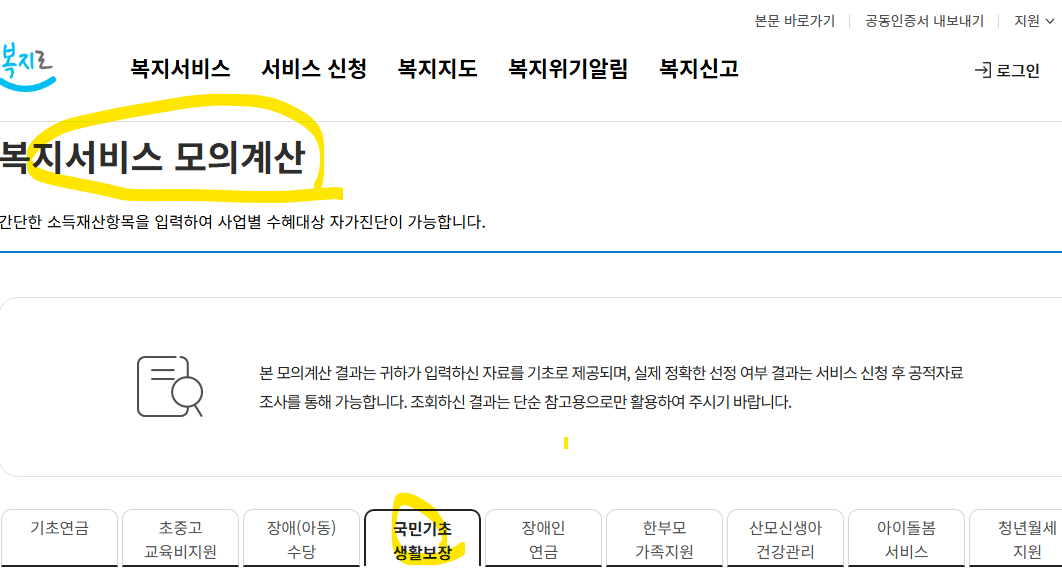 → 복지로에 들어간 후 복지서비스에 커서를 놓으면 모의계산이 나온다. 모의계산 하단에 '국민기초생활보장'을 클릭하면 모의계산을 할 수 있다.