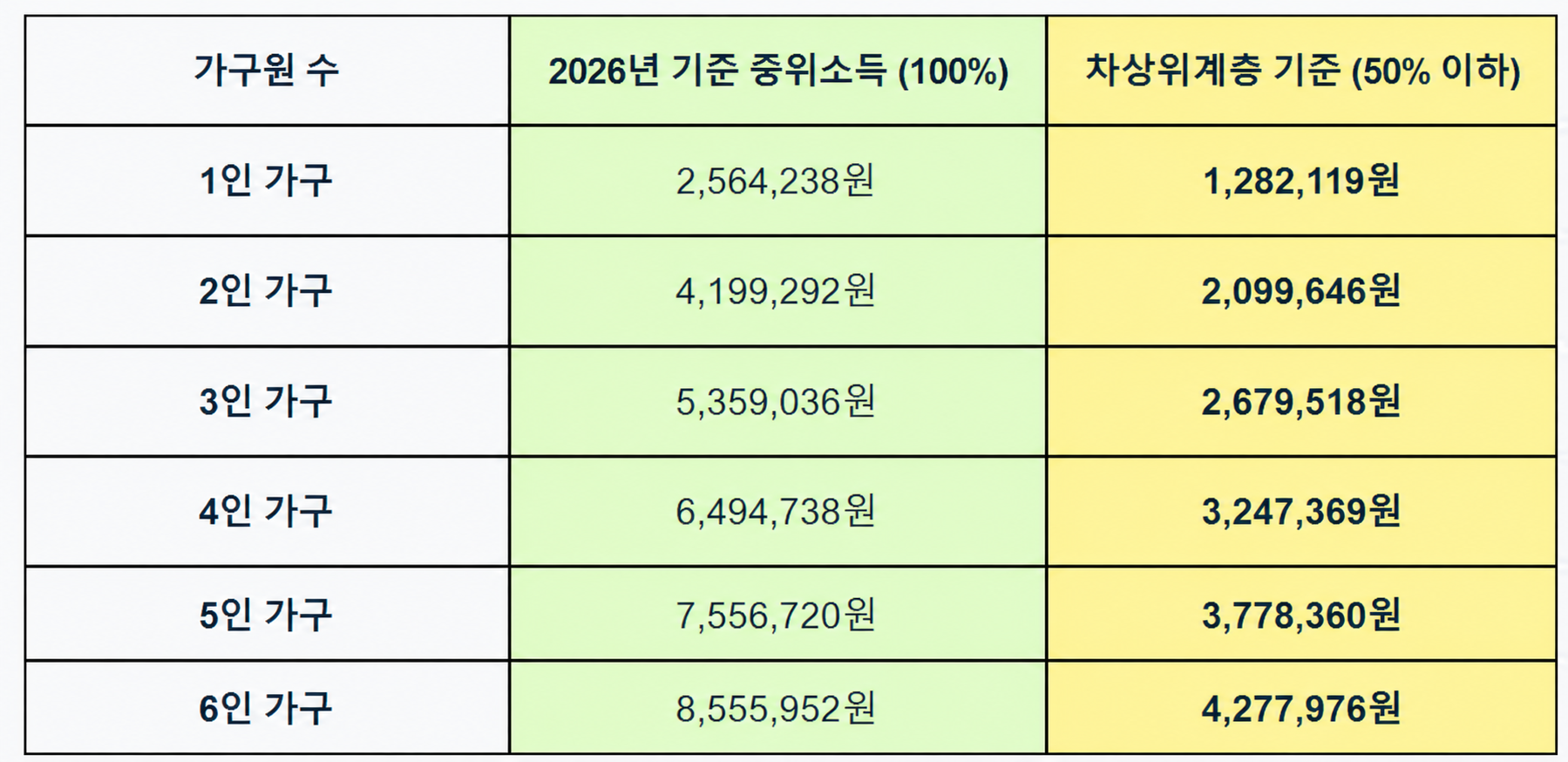 차상위계층은 생각보다 범위가 넓다. 2026년부터 중위소득 기준이 올라갔기 때문이다.