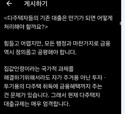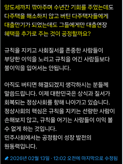 이 말을 해석하면 여러 채 금융 세제 혜택을 받았으니 이제 매물로 내놓으라는 압박이다. 양도세 중과 재개에 이어 이제는 대출 만기 연장까지 건드렸다.