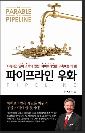 파이프라인 우화- 브루노는 물통을 나르면서 노동의 대가로 수입을 받으며 안정적인 삶을 추구한다. 하지만 파블로는 노동에 의존하지 않고 파이프라인을 통해 수입이 저절로 들어오는 안정적인 시스템을 구축한다. 참고로 물통은 자신의 노동을 대가로 수입을 받는 사람들을 지칭한다. 저자는 시간과 돈을 서로 교환하는 자본주의 시스템의 함정에서 벗어나 지속적인 잉여소득을 만들어내는 파이프라인을 구축하라고 주장한다. 저자 버크 헤지스, 출판 라인, 출판일 2015.12.28.