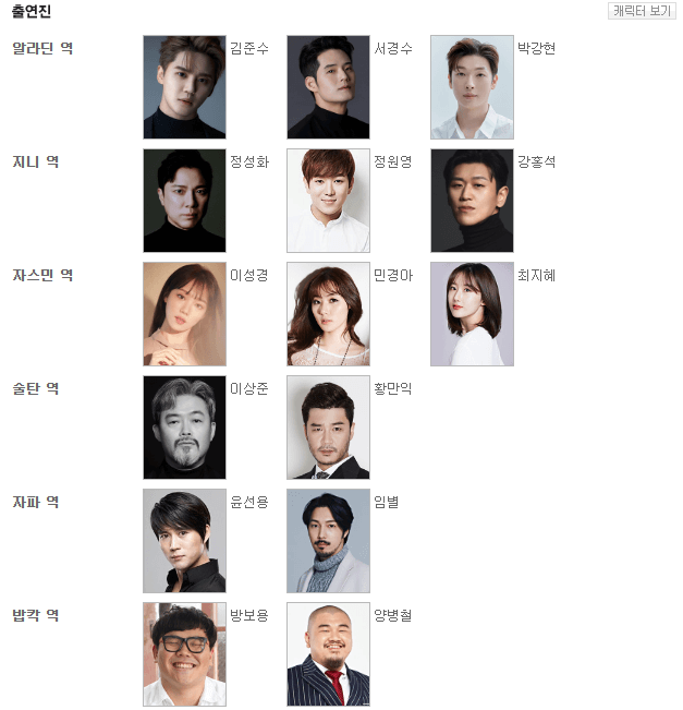 출연배우는 알라딘 역 동방신기의 김준수를 비롯해 서경수, 박강현, 정성화, 정원영, 강홍석, 이성경, 민경아, 최지혜 등이 출연합니다. 각 문화 예술계를 대표하는 스타와 10~25년 경력의 베테랑 배우들로 꾸렸습니다. 대한민국을 내로라하는 최정상 기량의 37명 배우의 시너지가 빚어낼 마법 같은 무대를 기대해도 좋습니다.