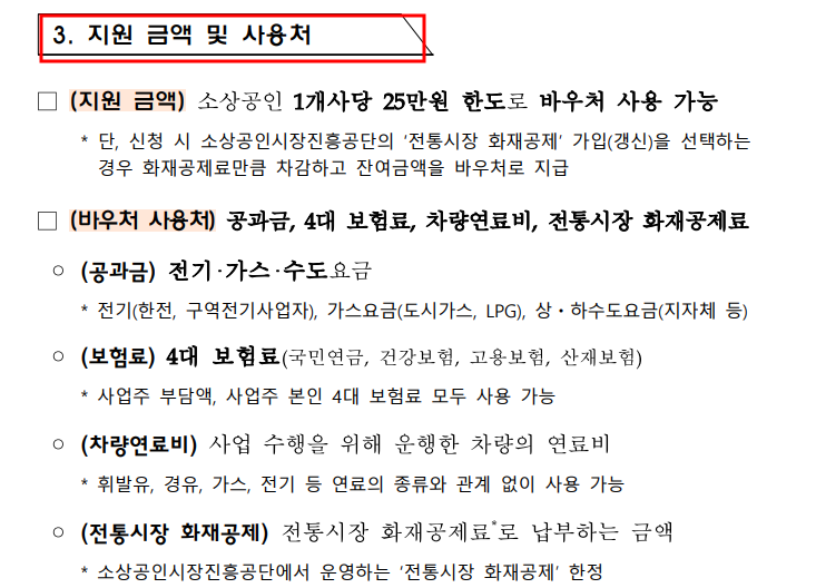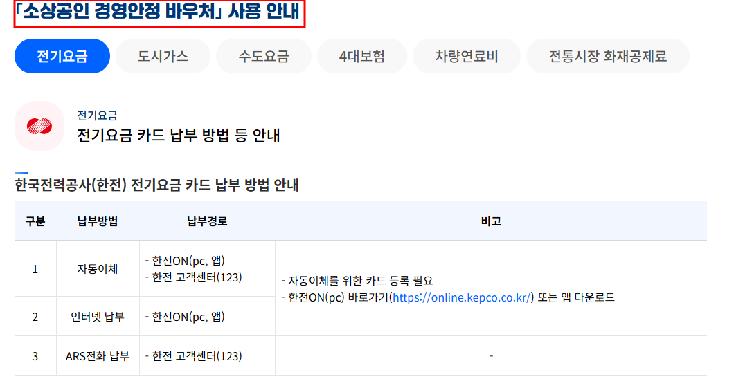 해당 홈페이지에 방문해 바우처의 사용법을 확인할 수 있다. 공과금(전기, 가스, 수도요금), 4대 보험료, 차량연료비, 전통시장 화재공제료 납부 방법을 쉽게 체크할 수 있다.