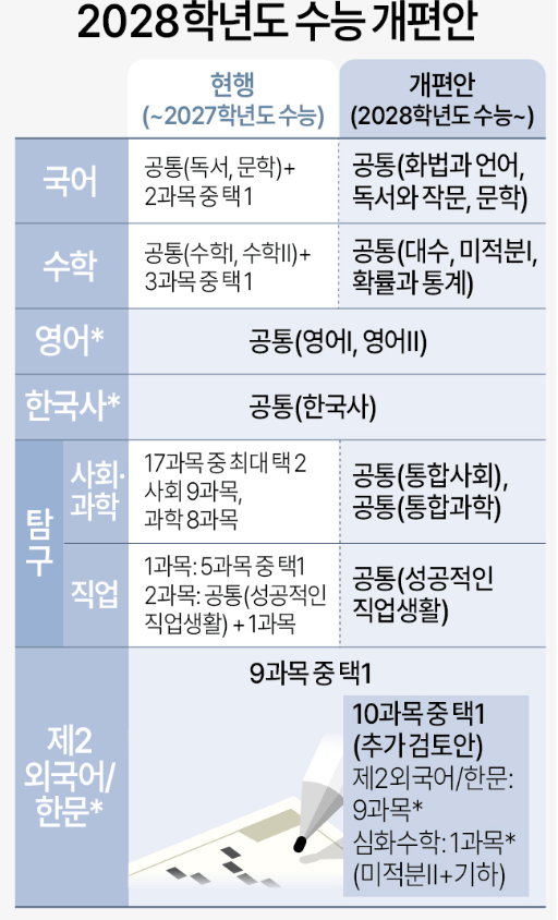 2028학년도 대입 개편안은 2025 개정교육과정 도입에 따라 추진된 것입니다. 지난해 12월 27일 확정 발표한 대입 개편안의 특징은 '통합형 수능'으로의 전환입니다. 모든 학생이 동일한 과목을 응시하자는 것입니다. 2025년부터 고교학점제로 공부하는 현재 중학교 3학년 학생들에게 적용되는 것입니다. 2028학년도 수능과 내신의 달라진 것을 살펴보겠습니다.