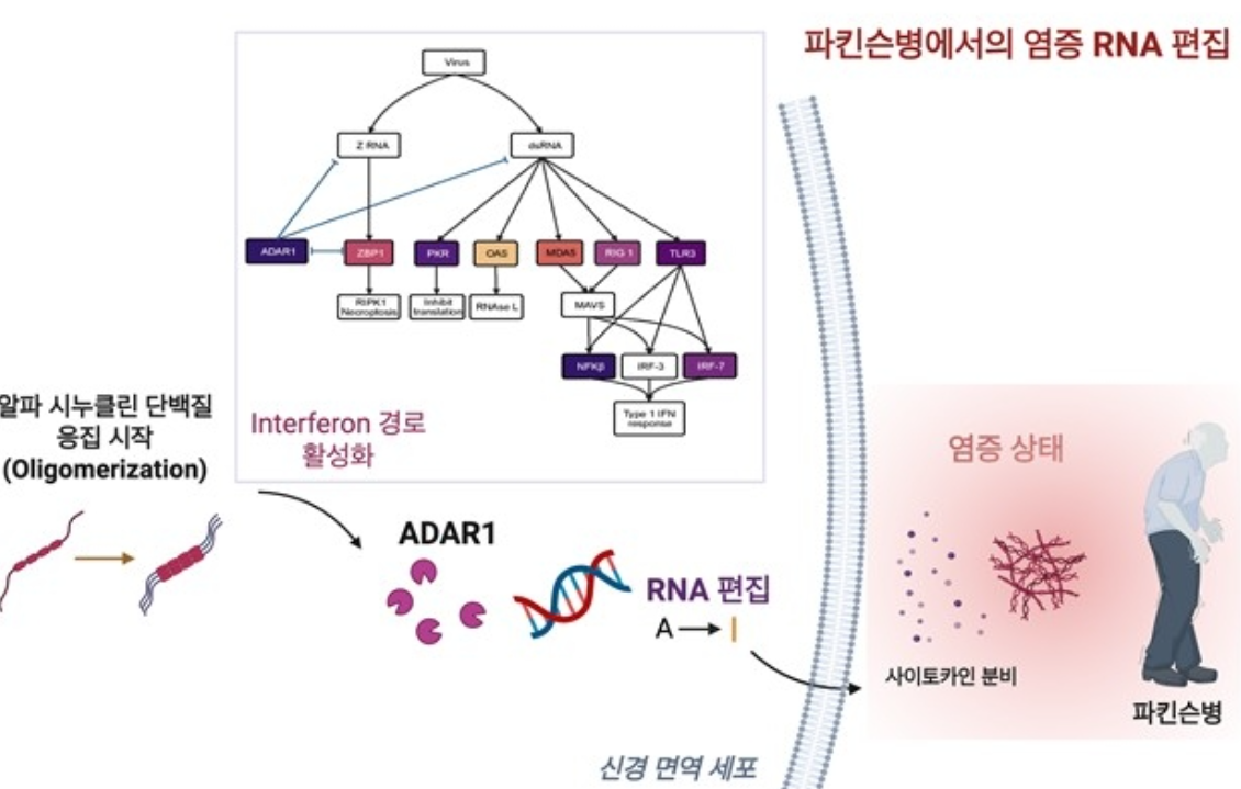 RNA 편집이 파킨슨병 신경염증 조절에 핵심 역할을 한다는 사실을 세계 최초로 규명했다. 파킨슨병은 뇌 속 알파 시누클레인 단백질이 비정상적으로 응집해 염증 반응을 일으키고, 결국 신경세포를 파괴하는 질병이다. 이번 연구는 파킨슨병의 발병과 진행 과정에 RNA 편집이라는 새 메커니즘이 존재함을 밝혀냈다.